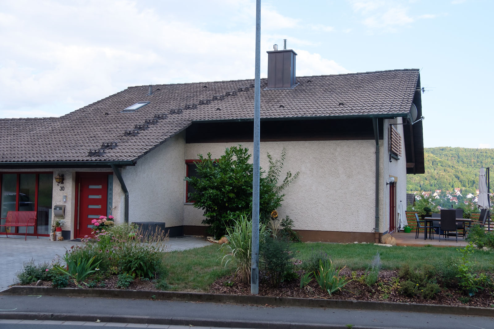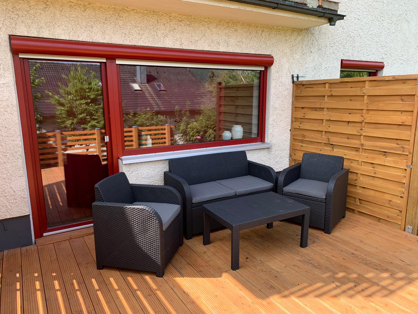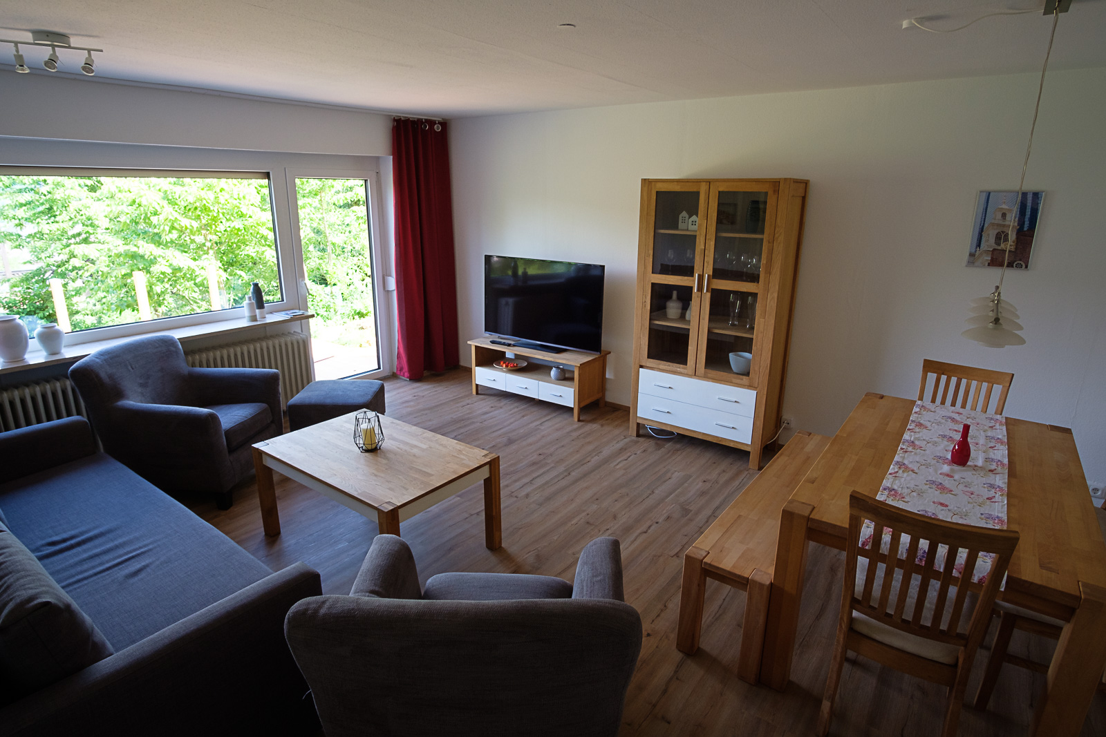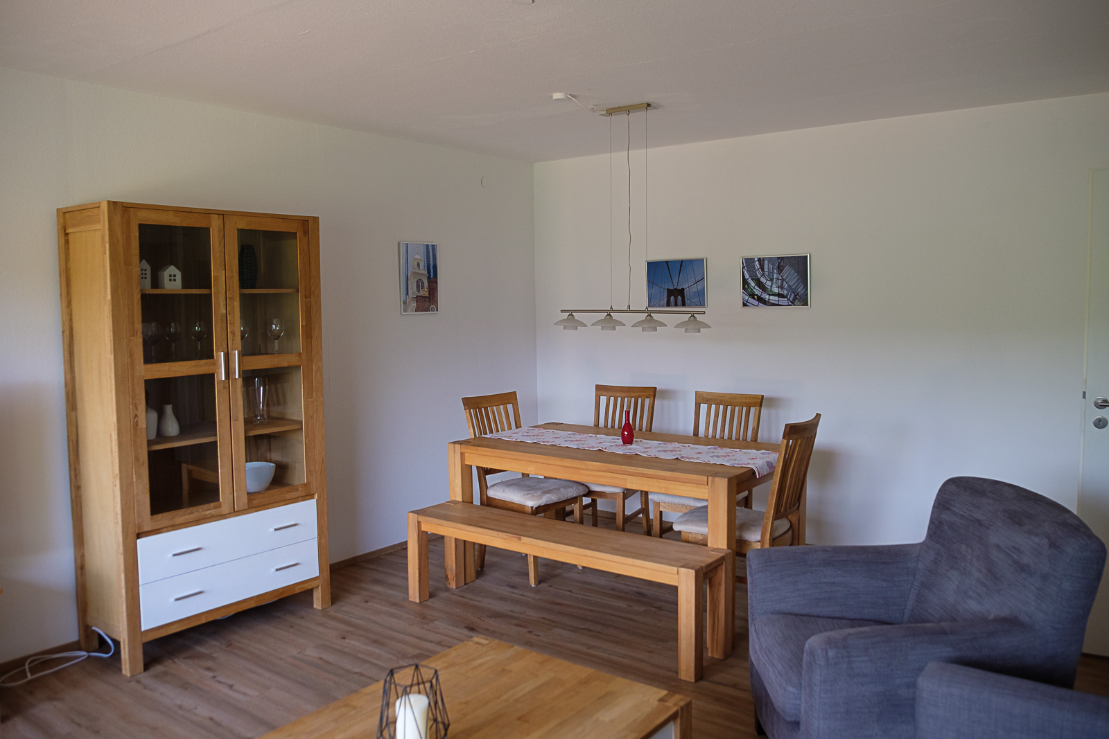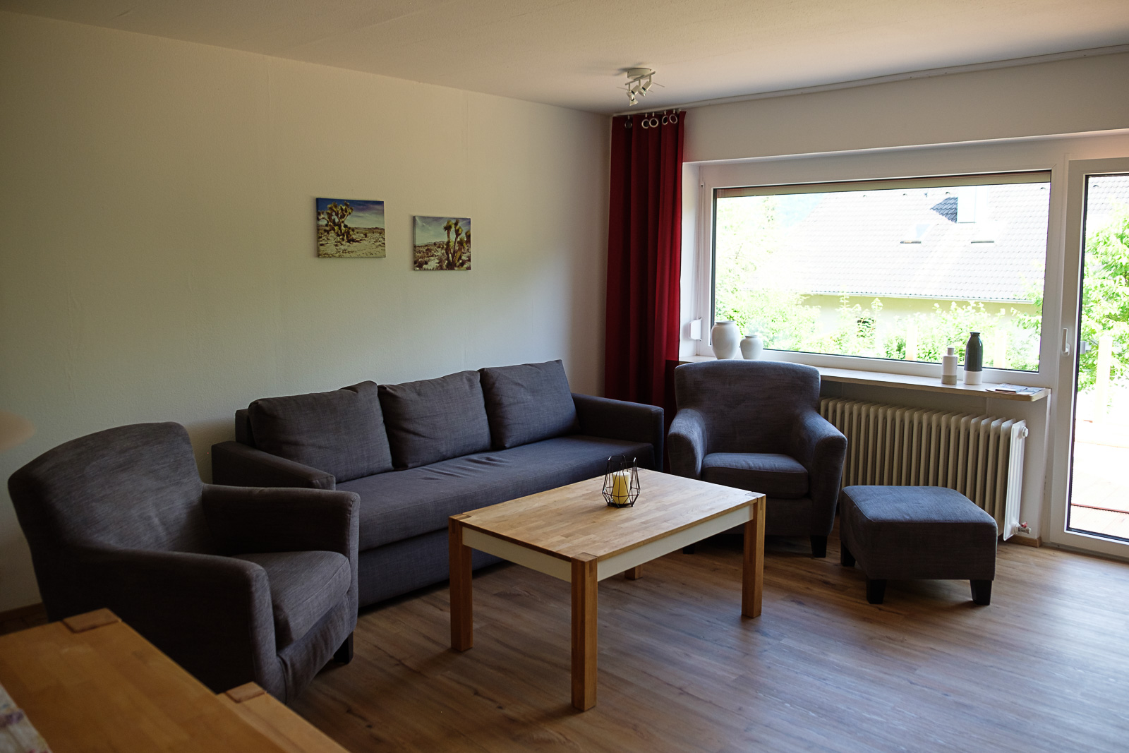 Das Wohnzimmer verfügt über einen Esstisch für 4 Personen. Nach einem aktiven Tag in der fränkischen Schweiz kann man auf der gemütlichen Sitzgruppe die Nachrichten auf dem 55-Zoll-TV verfolgen. An lauen Abenden lädt die Terrasse mit Blick auf Ebermannstadt zu einem Glas Wein ein.