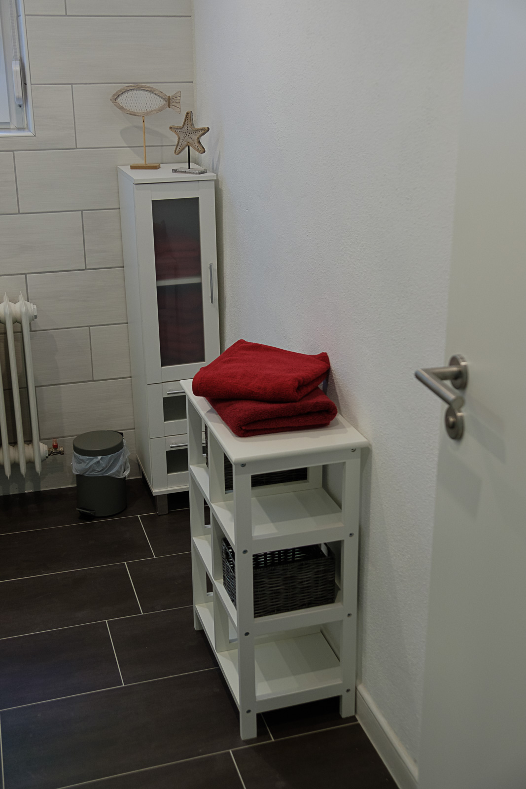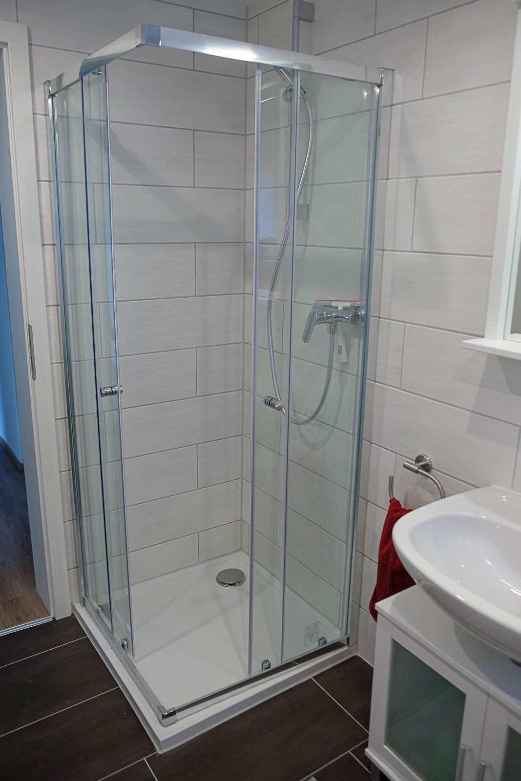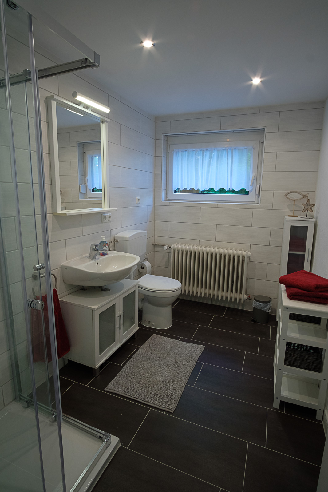 Das Badezimmer ist mit Dusche, Toilette und Waschbecken komplett ausgestattet.